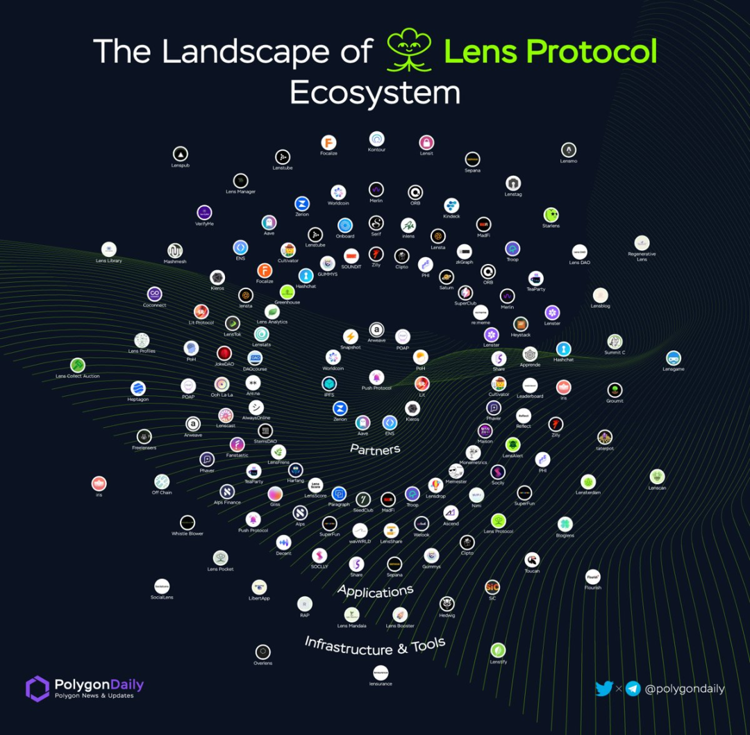 Lens 作为行业内耳熟能详的社交协议,最终目标是希望用户完全拥有其社交网络数据,并且可以将数据带到任何建立在 Lens 协议之上的应用程序。其在做情景产生的社交关系与 CyberConnect 很不一样,颗粒度也不同,主要是通过 Mint NFT 将关系绑定在一起,未来用户增量大之后就更加考验 Lens 协议处理用户量和储存内容的能力。2022 年年底,Bankless 的一条视频曾在 YouTube 上面被删除,为此他们专门写了一篇叙事文来描述 Lens 的魔力之开发者和用户体验层的创新。 YouTube 的不灵活性和中心化使得创作者别无选择,只能使用 YouTube Studio 来管理他们的赚钱方式、分析或安排播放列表。同时,YouTube 的观众被迫使用一种方法消费内容。Lens 通过解耦创作工具和消费工具来解决这个问题。开发者可以通过插入和使用各种 Web3 和 Web2 工具来构建应用程序,或者使用链上和链下的数据,所有这些都通过 LensAPI 相互关联。项目数据:截至目前 Lens 推特粉丝已经超过 22 年年初的 18 万达到 22 万 +,其 Lens Protocol Profiles NFT 已经积累了 99000 多个,月活跃用户约为 3.5 万。自 6 月以来,通过 Lens 的无 GAS API 中继处理的中继交易总计 790 万笔,约占 Polygon 所有交易的 4%。注意,由于并非所有 Lens 应用程序都使用此 API,因此所有 Lens 交易的真实数量会更高!