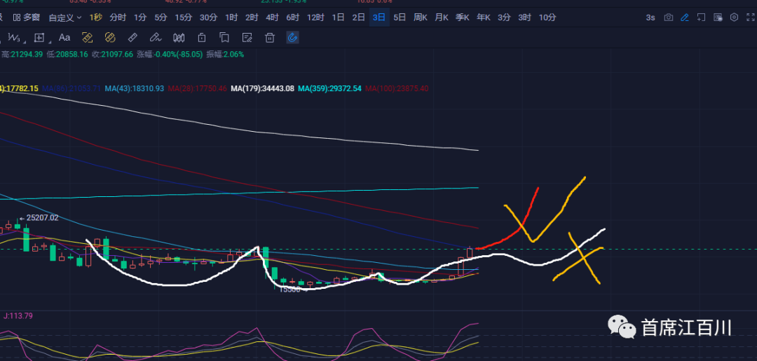 通常下影线是不会破前面一个阴十字低点的,但是玩幺蛾子的情况可以破一下但也绝对不会破白色7天线也就是大约20000美金的位置。如果是转化为中性震荡那么日线形态上就会形成典型的前阳后阴并列线,然后明天不破并列线低点上行。