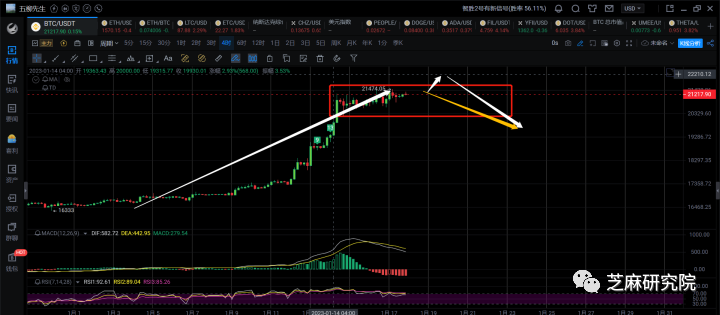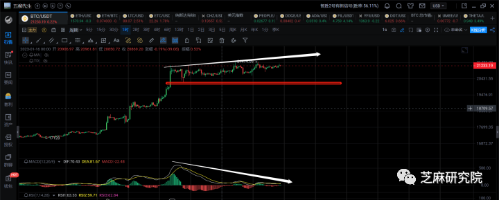 短线这里倒不是说完全突破不了21500,至少上方还是有一点点空间的,但是想要一下子突破22500~23000区间,那还是有难度的。所以这里无非说还能往上蹭一蹭,还是说确实有点上不去了。但不管怎样,当前反弹变缓是实际的。所以我可能更多的还是等个4h回调再次入场做多。如果给到大级别顶背,那我再小小的短空下也是比较合适的。