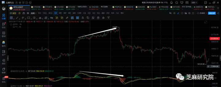 1小时级别,这里持续的顶背,但是价格没有回调,其实是比较恶心的,依然先关注后续回调后的20000支撑情况吧。