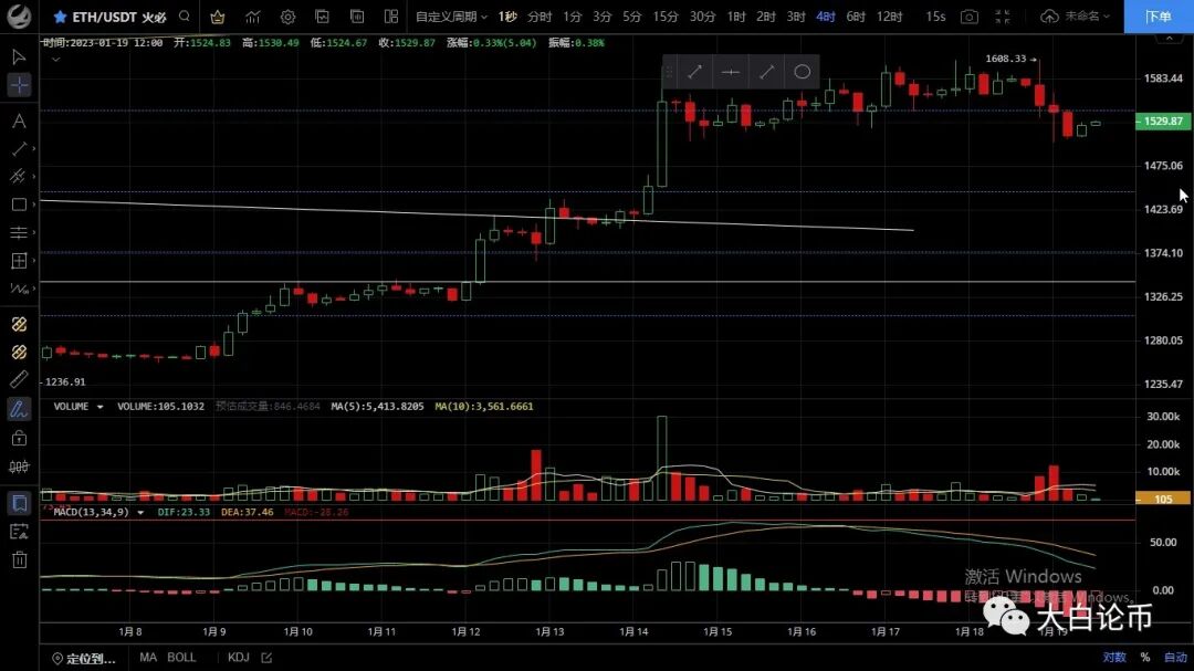 以太坊昨日走势和大饼一致冲高后未能站稳迅速回落,最低跌至1503一线后反弹,目前币价在1528附近运行,小时级别k线走出六连阳,空头逐步缩量双线粘合有金叉需求,ma7拐头向上,目前行情走势缓慢,预计还会走反复,下方1500支撑未破空头未走延续,四小时级别出现连阳,但上方阻力明显,ma7均线向下,macd呈死叉状态,短期行情上涨暂时告一段落,日内预计会反弹后再次回落,重点关注1450支撑破位的话本轮上涨打破,日内思路建议逢高做空为主低多为辅,上方压制1540-1575,下方支撑1500-1450