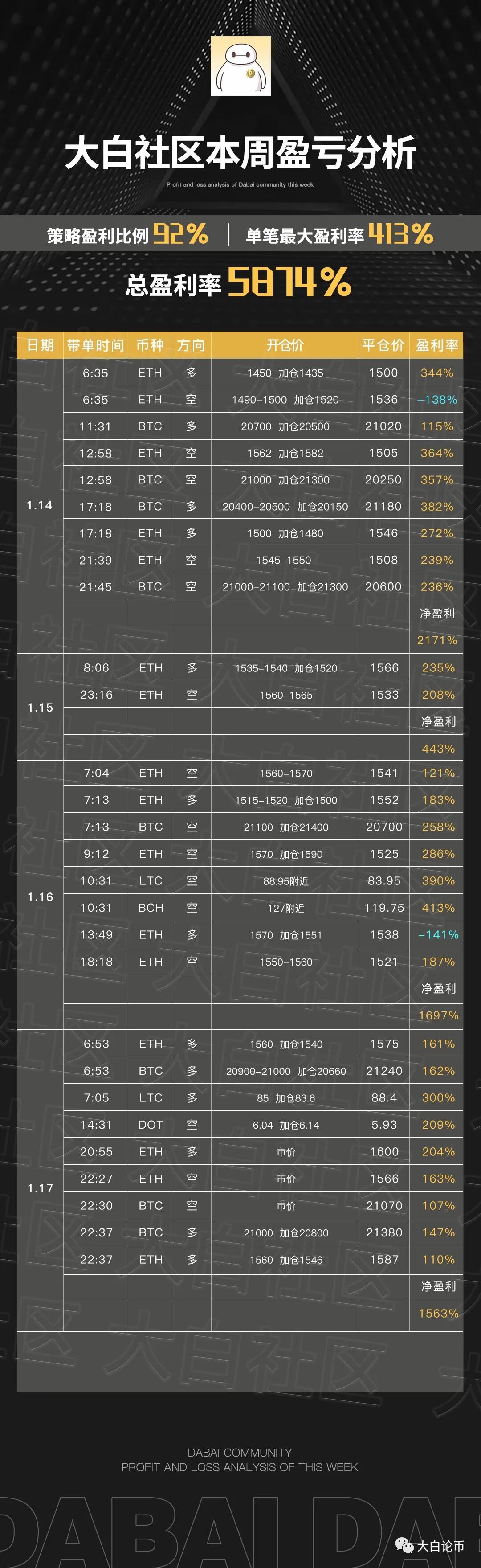 下方是大白社区本周实盘群单子,恭喜跟上的币友,如果你操作不顺,可以来试试水。