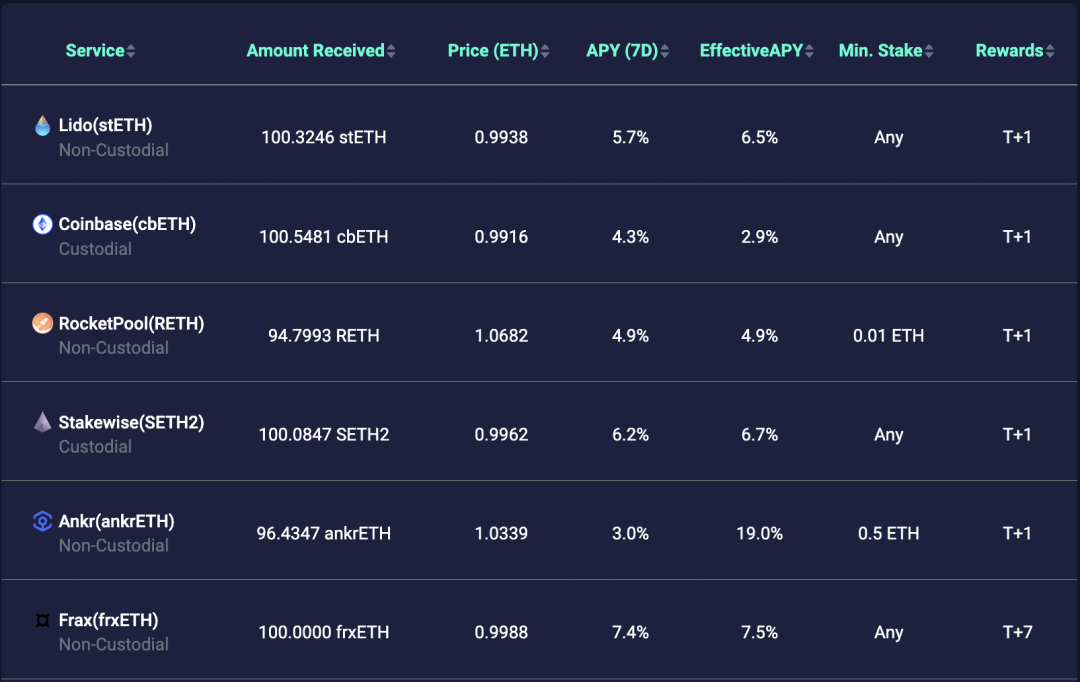 目前有多家服务商提供以太坊的流动性质押,大家可以选择一家进行质押,Chaineye.tools 对比了不同服务商的收益率和包括流动性在内的其他维度数据,帮助大家更好地选择。