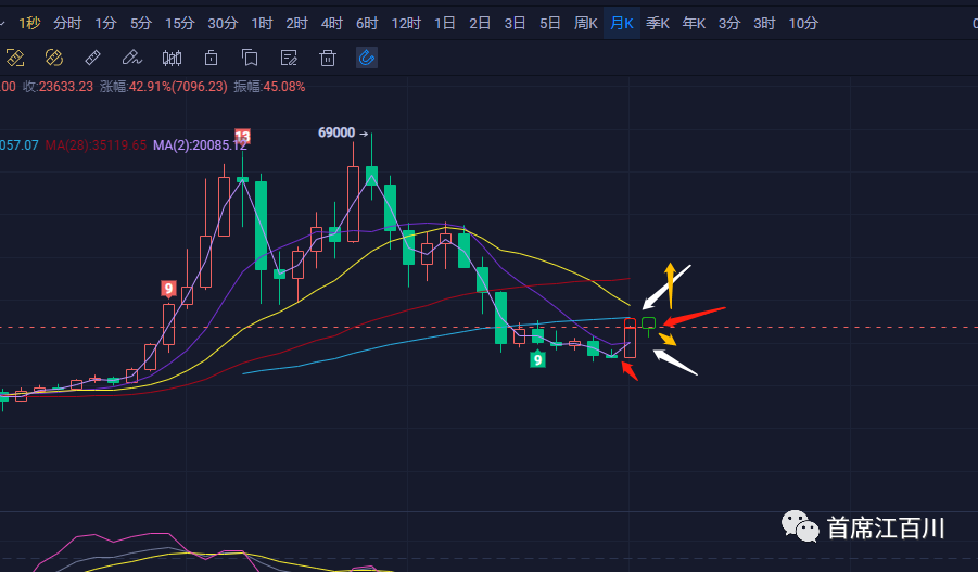 基于月线级别考量,如果本月直接收到26000美金一线,那么由于下方紫色短均线和蓝色43月线之间有空间(主要是43月线封杀上行空间,7月线对价格有吸引力),那么2月就可能是震荡月,形成类似12月K线形态的镜像T字来做一个震荡线。这就是第一种先快后慢。