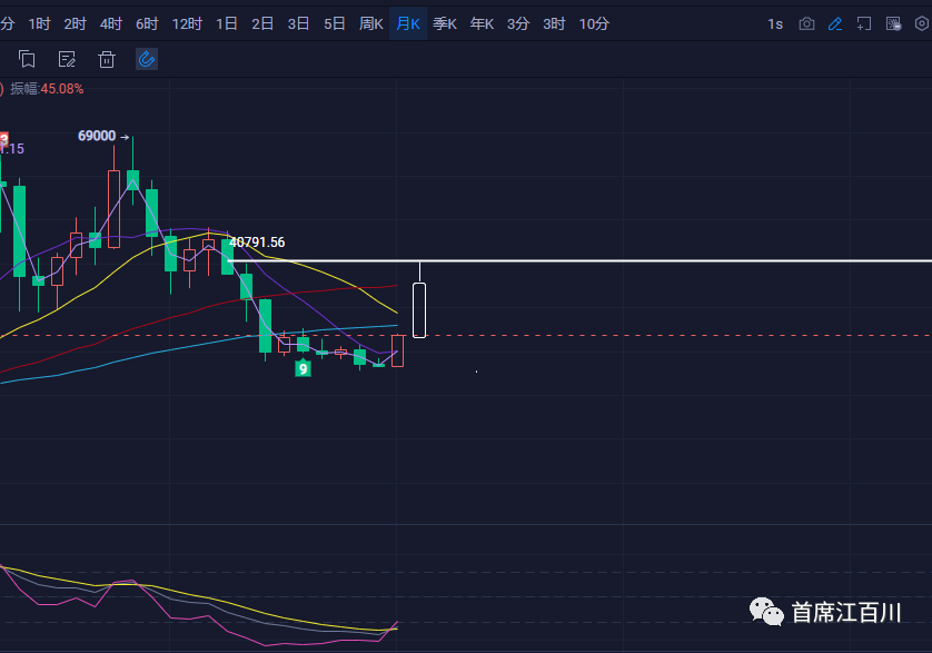 这种走势就是典型的底部确定就不给你机会,什么回调上车,什么等暴跌,都不给你机会,然后直接抬升市场参与成本,因为43月线没有抵达,就没有均线阻力,那么相比7月线对价格的吸引,自然是43月线更大,这样一来市场就会在2月继续上行,而上行的基础需求就是做出大饼的底部信号——低点到高点翻倍。而这个位置是相对浮动的,17590本身是底部,15480一线为刻意跌破诱空,所以根据这两个点就可以推算出大饼给出底部信号需要反弹至32000-35000一线,而同样这个位置是什么位置?是64800-69000一线的腰斩位,有意思吧。