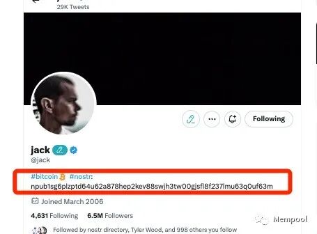 如果说长毛象是Twitter难民的庇护所,lens protocol受到以太坊社区的喜爱,Nostr则受到比特币神教的追捧。作为著名教徒Twitter的创始人Jack Dorcy,不仅曾给开发者fiatjaf捐赠了24个比特币,现在在这个网络上也极其活跃,在twitter上也公布了自己的Nostr公钥。
