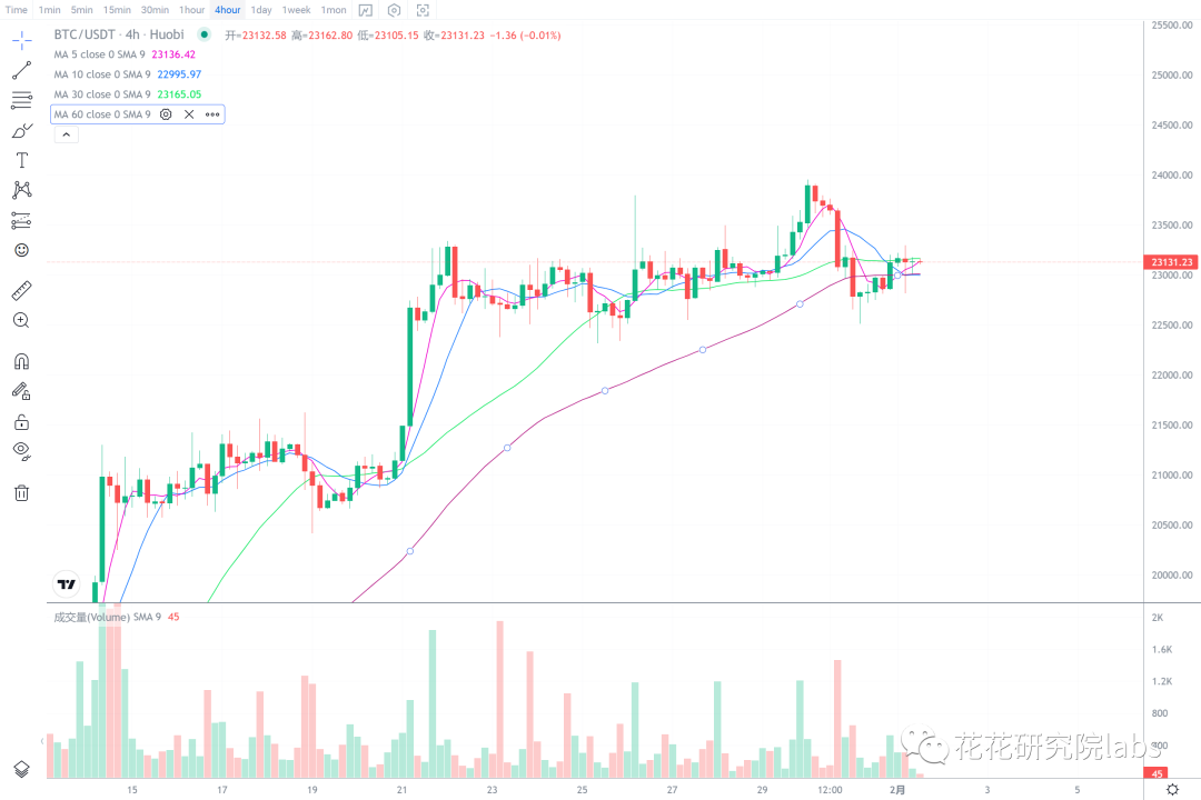 比特币已经在高位横盘了十来天,想跌又跌不下去,这个位置有一定的资金护盘,目前主要震荡区间为22300-24000,如果长时间不向上突破,反而跌破22300,则有画门的风险,短线只需要关注22300的结构支撑即可。另外,二月份需要关注以太系的币种,三月以太上海升级,以太系的币种在二月份有很大的可能会爆发一波。