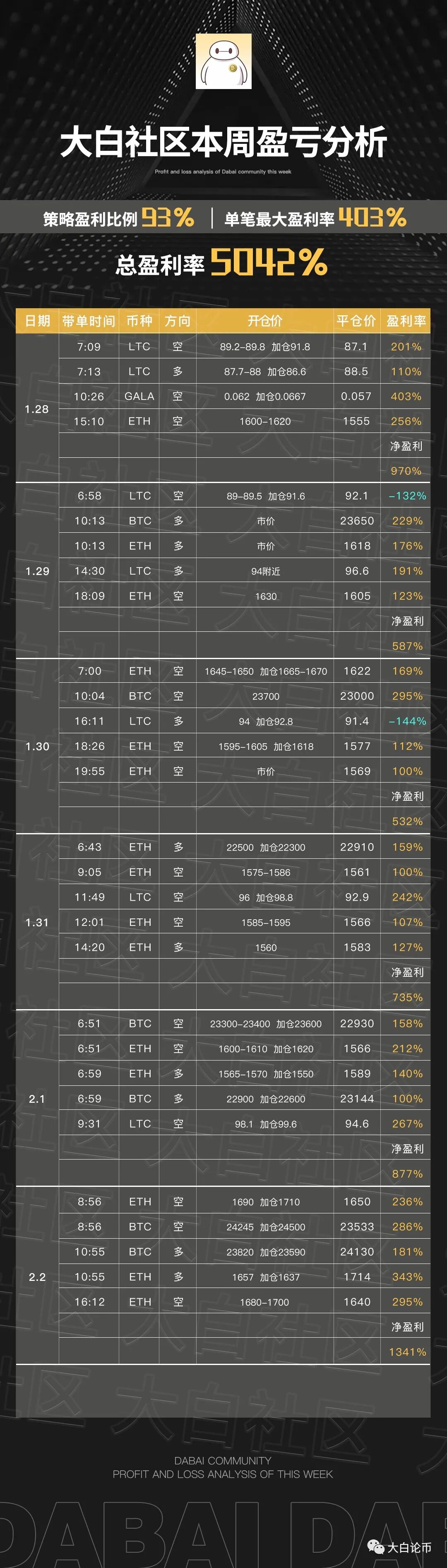 下方是大白社区本周实盘群单子,恭喜跟上的币友,如果你操作不顺,可以来试试水。