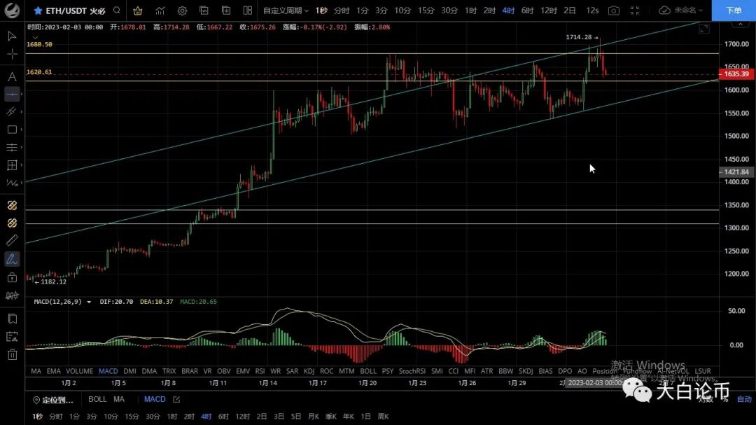 以太坊走势依旧跟随大饼,昨日白盘呈震荡整理,晚间回踩支撑后形成双底反弹再次冲高,以太坊力度比大饼较强,最高触及1714一线承压回落,最低跌至1627一线,恭喜跟上昨日思路的朋友多空双吃共计获利130点,目前币价在1646附近运行,四小时级别行情向上插针实体部分未能有效突破1680,破位前高后形成顶背离结构连阴回落,macd多头逐步缩量快线拐头向下,虽偏向空头但下方1620支撑未破不宜追空,日线级别收长上影说明上方压制较强有回踩需求,日内预计不会有太大波动,关注晚间非农数据再做顺势,操作上参照大饼,上方压制1680-1720,下方支撑1620-1600