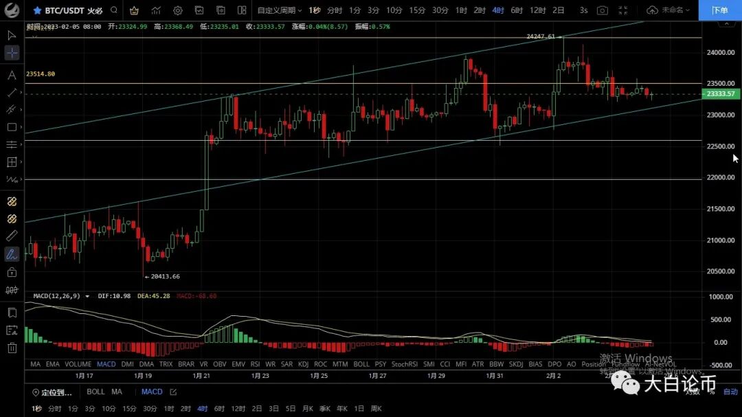 大饼近几日走势较弱,昨日也没什么太大波动,晚间冲高至23587一线承压回落,随后行情一路下行,目前币价在23320附近运行,四小时级别行情走势没什么变化,整体呈反弹回落反弹回落,且高点逐步在降低,ma7向下指引,空头依旧存在,有试探23000关口支撑的需求,思路和昨日一致高空低多对待,周末波动不大预计会走反复,上方压制23500-23700,下方支撑23000-22800