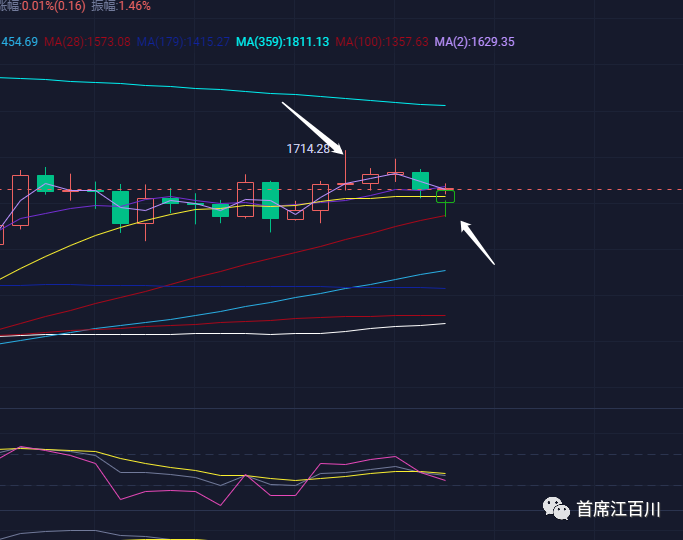 因为以太封杀空间,并且目前并没有破线的意图,日线上震荡高低点都在抬高,28线就在脚下: