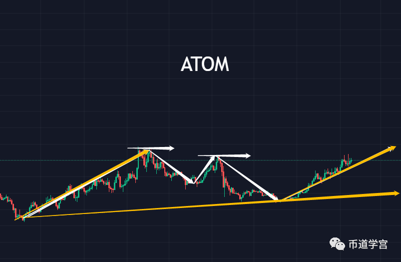 ATOM属于慢性成长币种,现在已经形成二段下跌节奏,又重新回到前面波峰之上,这就有势能,有成长性,不过介于它之前的表现,这最多就50个点的幅度,成长性太慢。