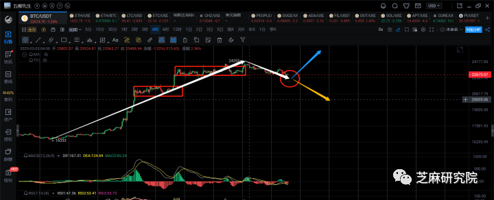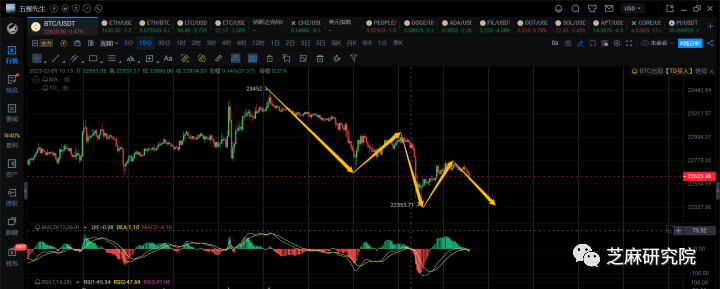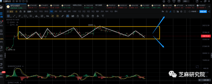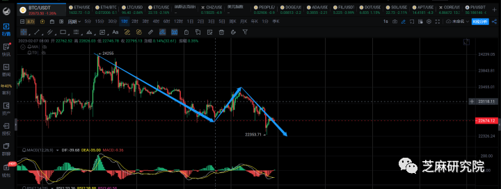 既然已经回落下来了,那么目前应该怎么去看呢,是继续下跌还是反弹一波。首先你得关注22300附近的支撑是否有效,有效撑住(插针跌破22300,但1小时k线又能快速收上来还是算有效撑住)的话,我们可以继续维持还有机会反弹的思路。倒不是说非要看涨,只是这个位置已经回踩多次了,可以认为是短线走势的一个分水岭。就好像2022年9~11月份,18100成为进一步下跌还是短线反弹的一个分水岭。