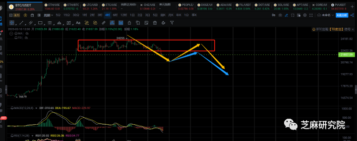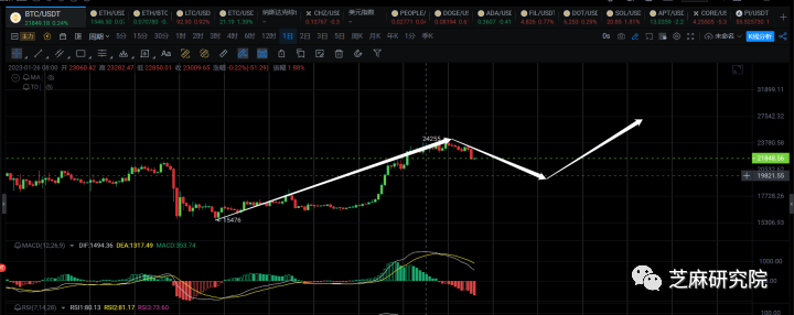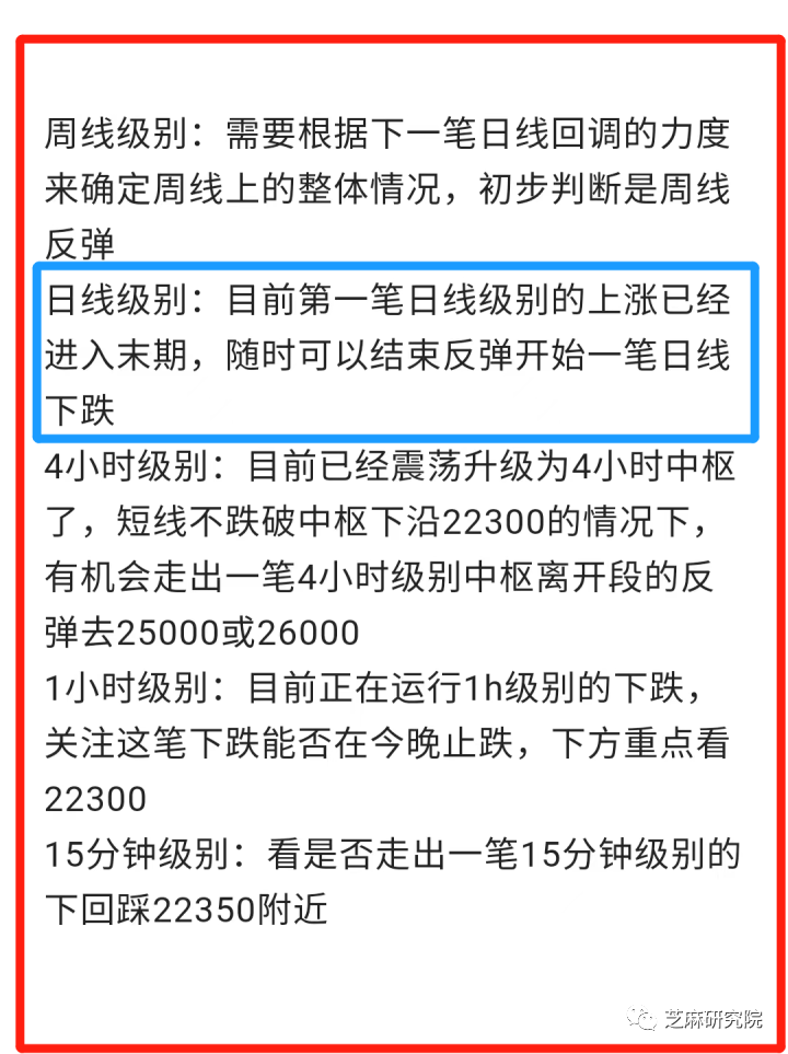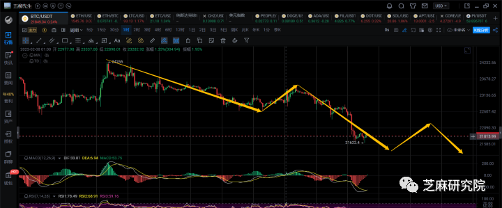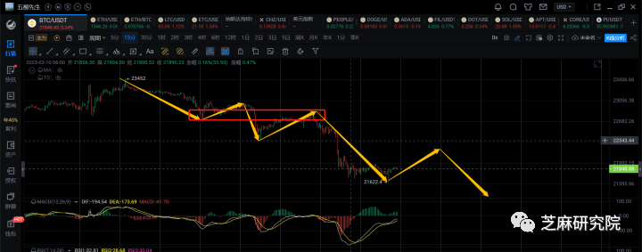 如果4小时反弹力度大一点,可能会重新拉回到4h中枢内,不突破中枢上沿23500情况下,继续运行第三笔4h级别的下跌。第三笔4h下跌的目标20000附近。