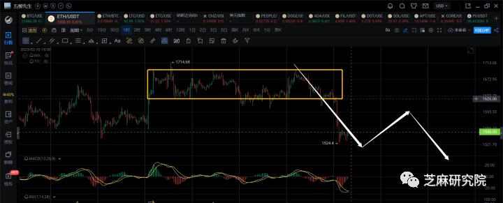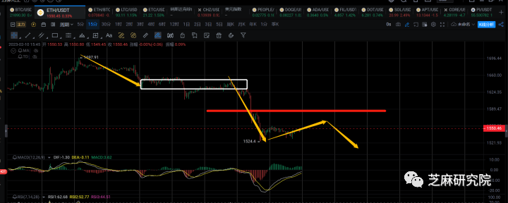 以太4h级别,目前还是一笔4h级别的下跌,暂时没有看到4h下跌结束的信号,下方可以关注1480~1500附近。