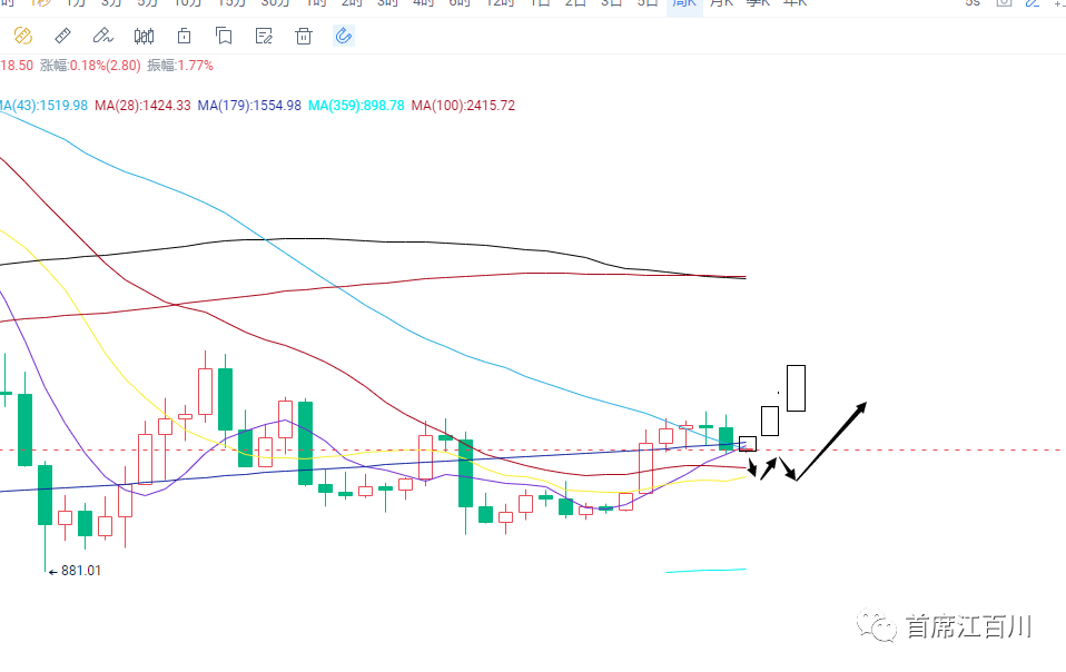 以太和大饼属于一个路数,但是它这几天的震荡已经玩过了,阴阳并列之后再接阴线,如果今天要反弹再玩类似周六小阳就不合适了,只能大阳,符合并列线低点不破可以直接姐三倍阴线幅度阳线的玩法,如果没有这个能力,那么最好和大饼保持一致,今天收一个小的十字星,明天再去还一个启明星就好了。