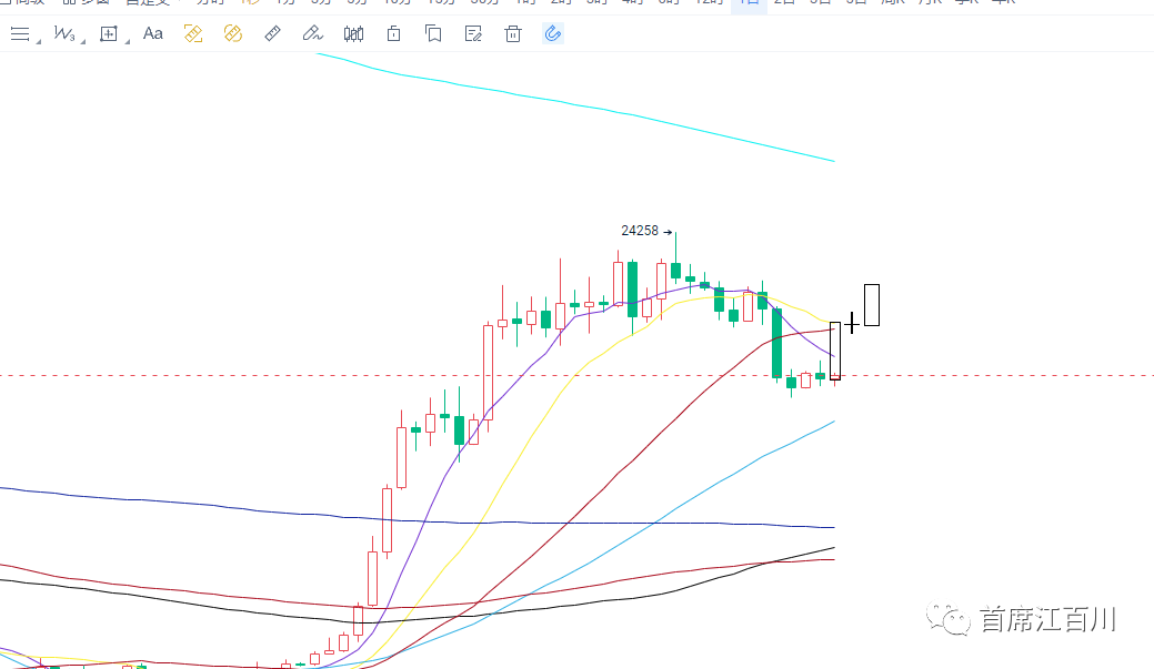 第一种黑色路径就是3K挖坑结束直接强烈反弹,反弹的最低需求在23150美金上方,概率相对低一些,另一种则是今天继续保持当下状态小十字星,明天做一个类似启明星的玩法,因为强度变低了,所以阻力会在大约22400-22800美金之间。我比较期待前者,但理智来说后者可能性相对大一些。