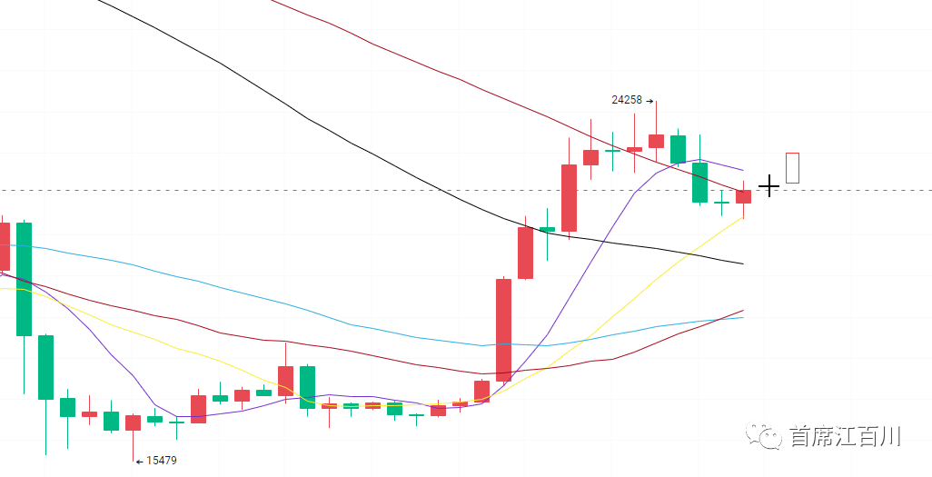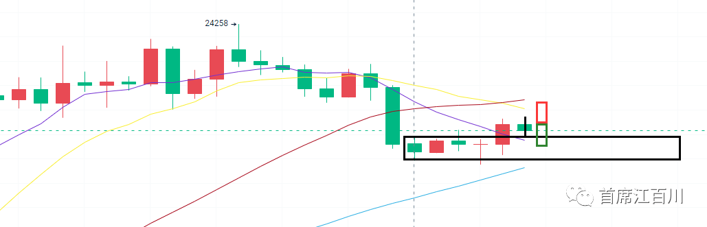 日线级别强势的话可以继续拉实体阳线,不过概率相对不怎么高,因为如果真的足够强,那么昨天就可以拉到黄色均线22600美金附近了,既然没去,那就说明强度不够,强度不够今天就有震荡的需求,震荡空间在21900-22500美金之间。如果形成类似前天十字星,那么明天就有复制粘贴继续阳线实体的可能,和黄昏星两种玩法。前一种为强势继续上行,后一种则是重回黑色箱体21400-22000美金之前震荡,等待后续选择。如果是后一种那么将再拖三个交易日,市场下一个变盘窗口就是20号。