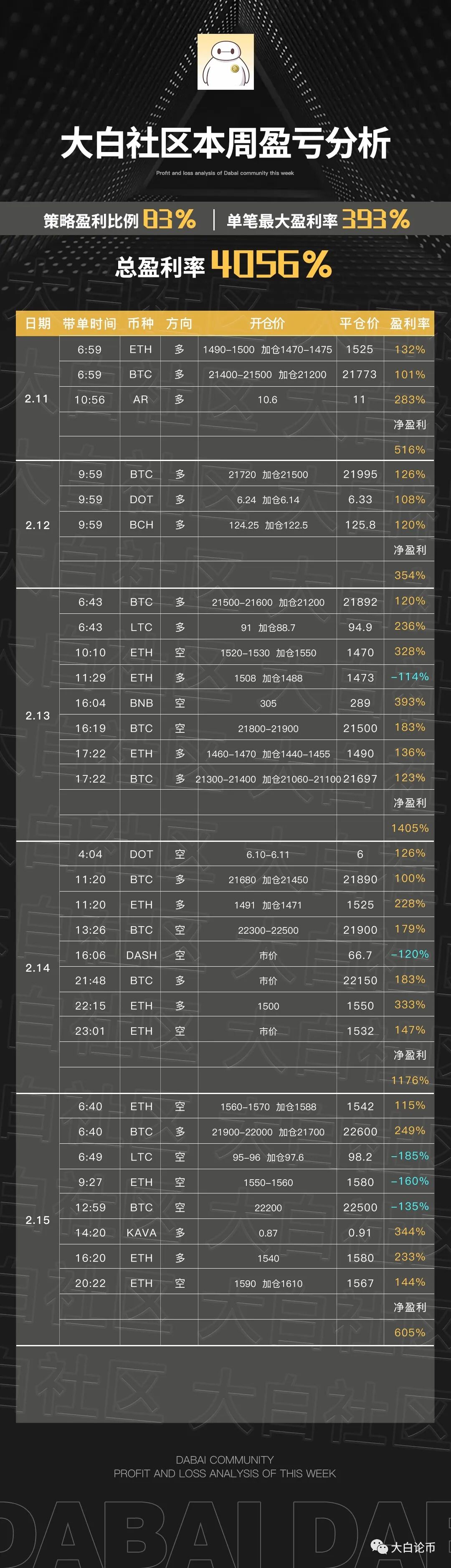 下方是大白社区本周实盘群单子,恭喜跟上的币友,如果你操作不顺,可以来试试水。