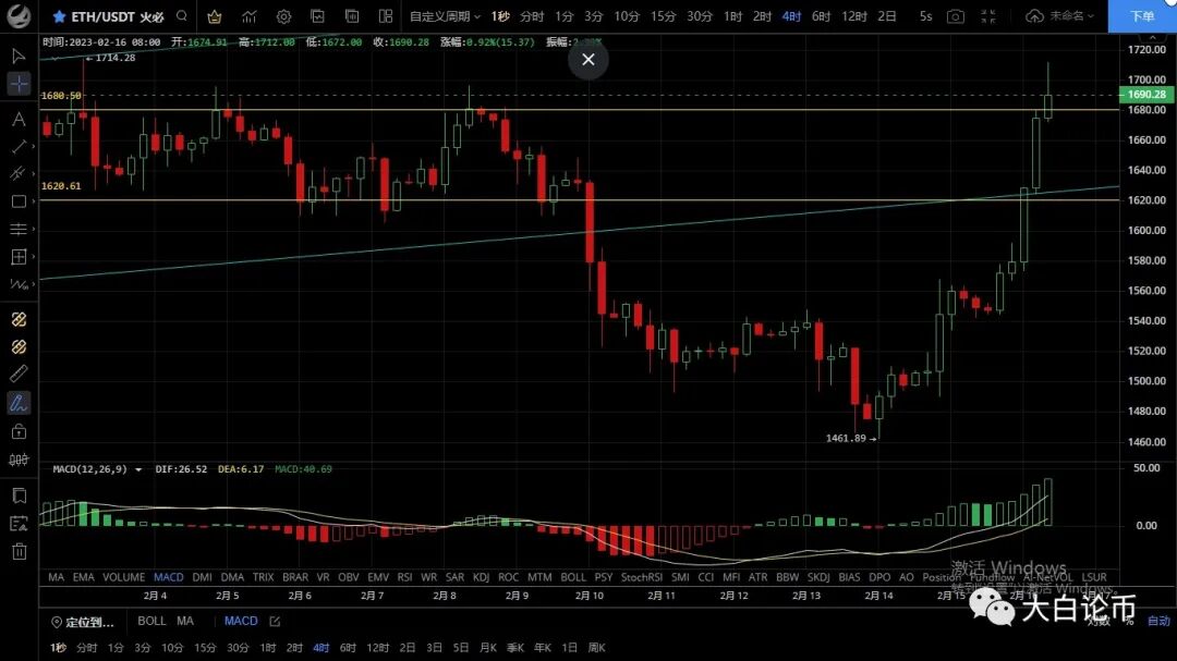以太坊昨日走势和大饼一致,震荡后选择向上突破,期间虽有回踩但力度不大,行情一路飙升最高触及1712一线承压回落,目前币价在1688附近运行,四小时级别macd多头逐步放量双线金叉向上延伸,行情再次突破1680阻力来到前高附近,多头重新收复失地,表现较为强势,日内突破前高的概率较大,短期行情收长上影,上方受阻明显,目前呈高位切勿追涨,先关注回踩力度再逢低做多,上方若有效突破1780有机会试探2000关口,既然多头表现强势那么思路建议顺势而为回踩低多为主高空为辅,上方压制1720-1780,下方支撑1680-1650