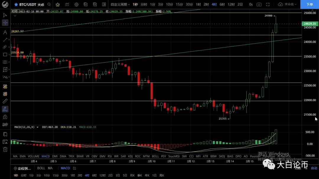 大饼昨日震荡后选择上行,晚间突破站稳22600上方,多头走出延续,暴力拉升最高触及24900一线承压回落,目前币价在24650附近运行,四小时级别盘面可以看出呈u型反弹,k线走出六连阳,多头强势拉升突破多个阻力破位前高,,macd多头逐步放量双线呈金叉上扬,ma均线拐头向上指引,整体来看多头较为强势,日内关注25000关口阻力,强压不会轻易突破,切勿高位追涨上方空间不大,若有效突破关注28000一线,短期多头滞涨有回踩需求,日内思路建议回踩支撑低多,阻力区域不有效突破逢高做短空,上方压制25000-25200,下方支撑24300-23800