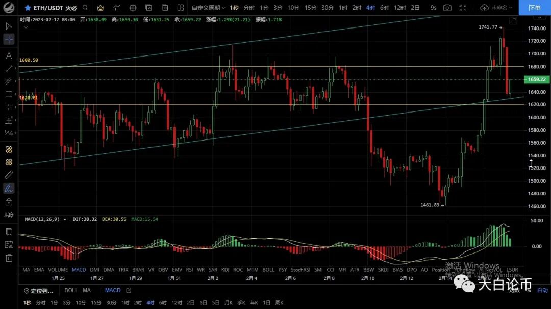以太坊近期与大饼走势保持一致,昨日晚间行情回踩至1665一线支撑反弹,多头力度较强直接冲破前高至1740附近承压回落,最低跌至1630附近,恭喜跟上昨日思路的朋友多空双吃共计获利近200点,目前币价在1657附近运行,四小时级别行情连续三天上涨近300美刀,多头表现较为强势,目前冲高后承压大幅回落,多头逐步缩量双线有高位死叉迹象,不断试探下方支撑,短期盘面有止跌迹象,空头没有走出延续,回踩不破关键支撑仍有继续上行的预期,日线级别上涨结构未遭到破坏,冲高后伴随回踩才是健康的走势,日内思路建议关注回踩力度逢低做多为主高空为辅,上方压制1675-1700,下方支撑1630-1600