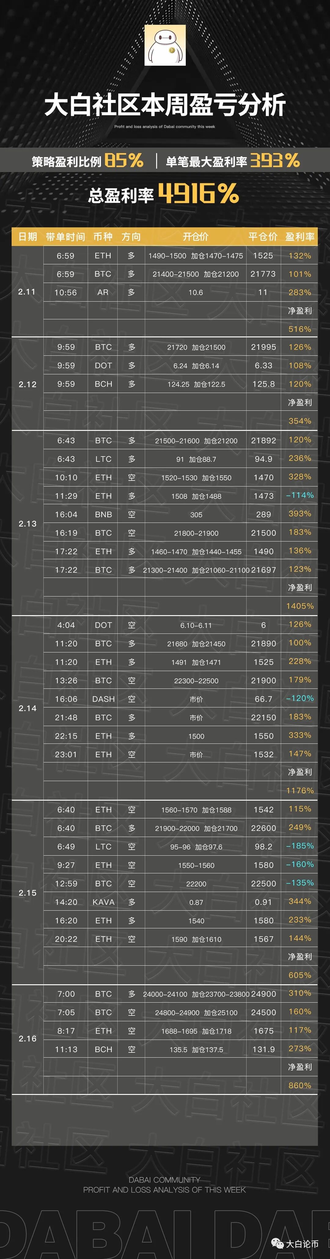 下方是大白社区本周实盘群单子,恭喜跟上的币友,如果你操作不顺,可以来试试水。