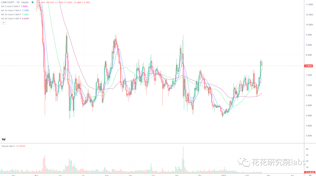 link已经突破局部的震荡区间,下一个比较大的压力就是9.5了,这一波先到9.5很简单,就看后续突破9.5的情况,若能突破站稳9.5,15以上基本上就到了。