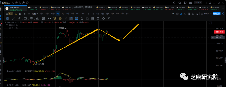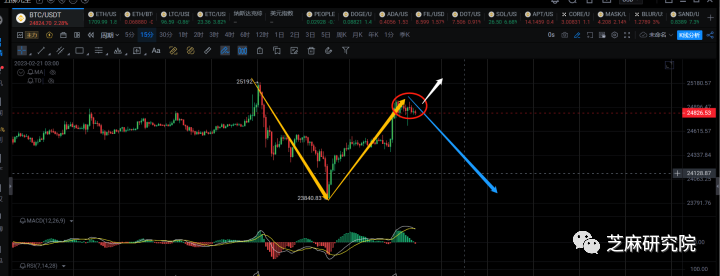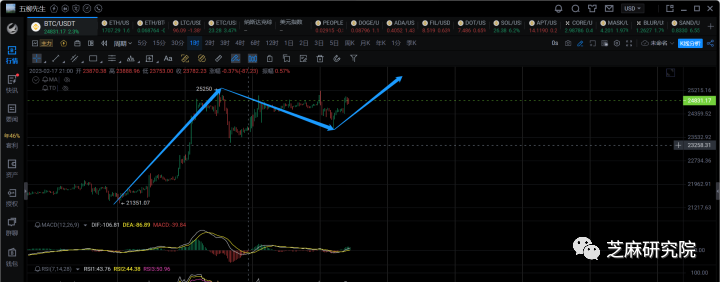 这样就有可能向上运行第三笔1h级别的反弹了,所有结构会存在不同。但是在操作上,其实可以做多手准备,如果当前上不去再次回调,可以等23800附近的位置做多,止损23100。如果又再次向上突破25200,那就先不要着急做空,观察是否加速。