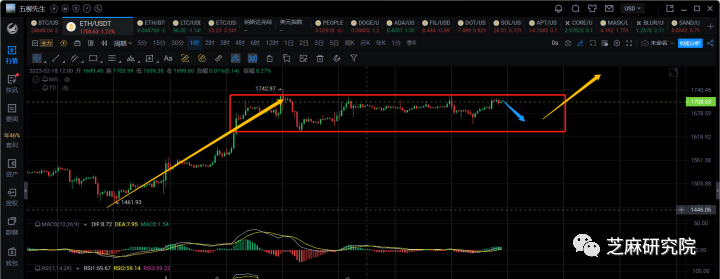 以太这里也是持续围绕1630~1720做区间震荡,这里很大概率震荡完成后还会再从向上突破,但是这里并没有太多好的操作机会,如果短线能够再向下走个15分钟级别的回调的话,还是可以考虑在1650附近接多,如果没有给到机会的话,最多还是持有现货。