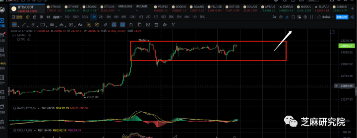 1小时级别:目前处于23500~25200区间震荡中,有一定概率震荡差不多后再次上冲