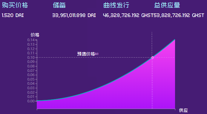 在项目早期团队的初衷更多的想让用户去体验产品,而非短期的炒作,因此引入了联合曲线的发行方式,即GHST的总供应量是动态的,当投资者使用DAI购买GHST时,会铸造新的GHST,导致流通中的GHST总量增加,反之亦然。这样一来,一旦存在价差,聪明的机器人将能够在代币联合曲线和其他DEX(如Uniswap和Balancer)之间套利GHST价格差异。而且联合曲线的机制也决定了随着代币价格的上升,拉盘的成本也将呈指数级上升。