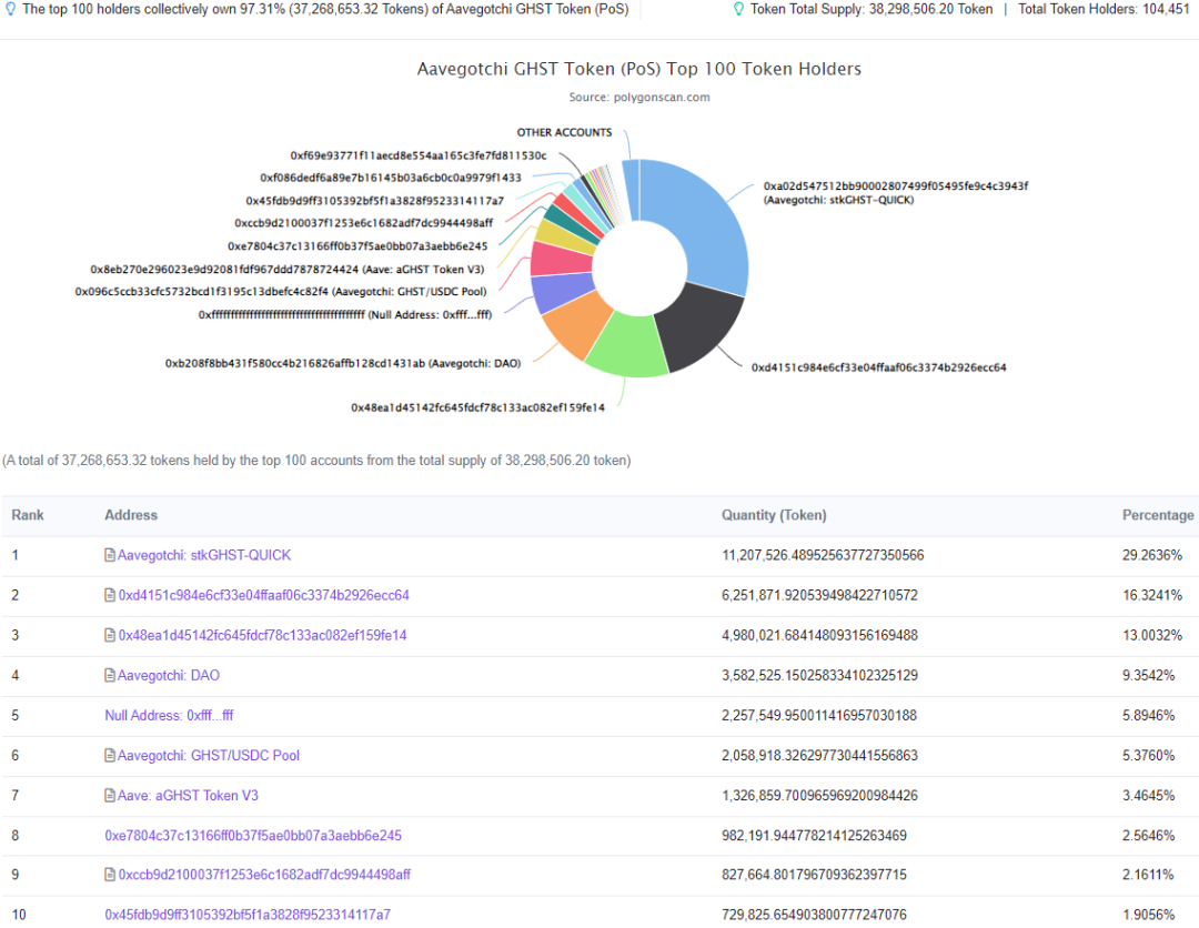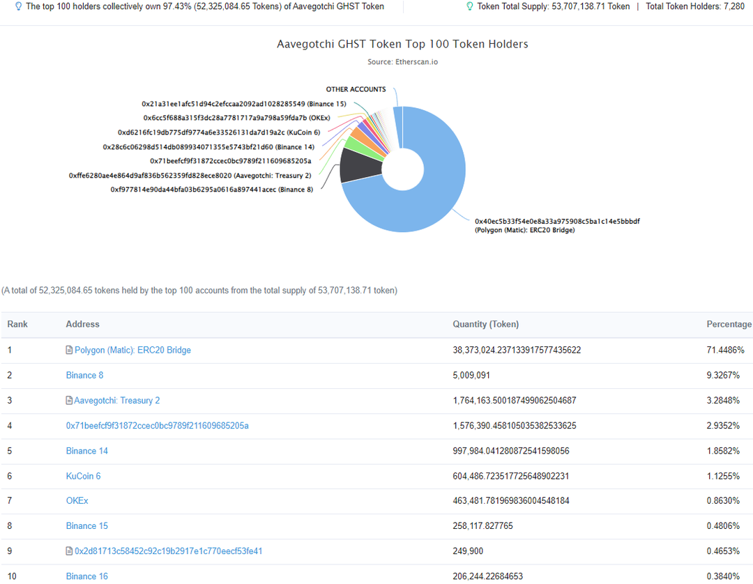 结合两条链的情况来看,扣去合约地址的持仓占比,整体上GHST的持币较为分散。