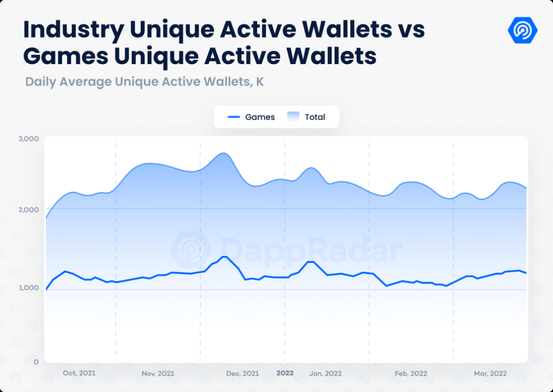 近一年多的时间里,区块链游戏取得了爆炸式的增长,根据DappRadar的统计口径,2022年Q1平均每天有117万个唯一活跃钱包(UAW)连接到区块链游戏,其中2022年3月日均唯一活跃钱包数量超过122 万。而这一数据在2020年Q3只有2.3万的UAW,在过去一年多的时间里环比增长了53倍。
