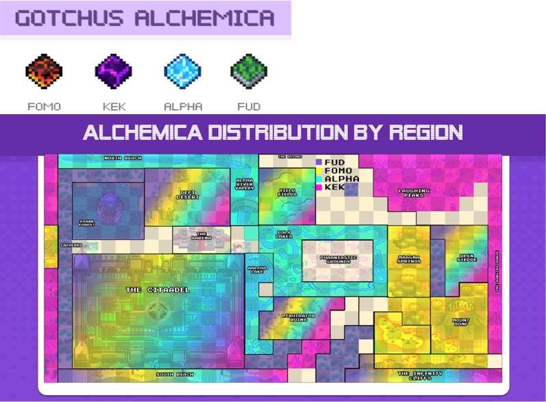 一是耕作土地,通过不断收集炼金币(Alchemica,ERC-20代币)来加强你的土地,以生产更多的产量。并且通过花费炼金币可以建立防御结构(装置),为预言中预告清算者入侵做准备。类似传统的DeFi Farming格式,不过用于Farming的资产需要玩家自己去肝,或者直接氪金购买。