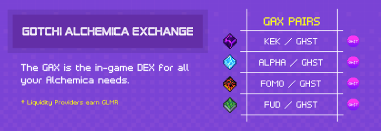 3)交易DEX,游戏内还将推出一个由智能合约伪装成为NPC的炼金交易所Gotchus Alchemica Exchange(GAX)一个DEX,用以支持所有 Alchemica/GHST 交易对,用户可以直接使用GHST购买游戏内相应的炼金币。同时,为了鼓励用户在早期为池子添加LP,对于流动性提供者还会发放相应的GLMR代币奖励,此代币可以减少装置制造的时间,进一步扩大开采炼金币的优势。