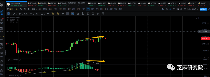 目前大饼2日线已经出现了一个顶背,但是熟悉macd指标的我们都知道,顶背不一定代表着行情就会马上下跌,回顾历史K线就会发现,有时候顶背了也会继续拉盘,所以指标的胜率只能达到50%~60%,我们判断行情一定是结合多个方面综合去看的。