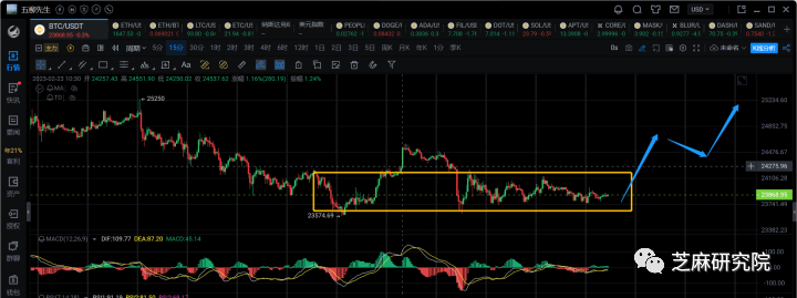 1小时级别:目前处于23500~25200区间震荡中,短线多空决战即将到来,快要变盘了