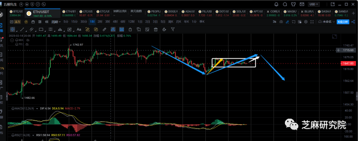 以太这里15分钟级别也是在区间震荡中,看短线能否再去一趟1670附近,完成标准的1h级别的反弹。但如果反弹无法突破1700,那会继续看下一笔1h级别的下跌。以太的日线目前也是顶背了,不说能马上下跌,至少短期如果有拉盘那预计还是会在1750~1800区间受阻。