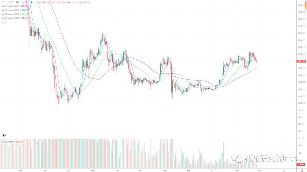 以太坊四小时向下调整,整体看涨走势不变,1600以下逢低分批低吸即可。