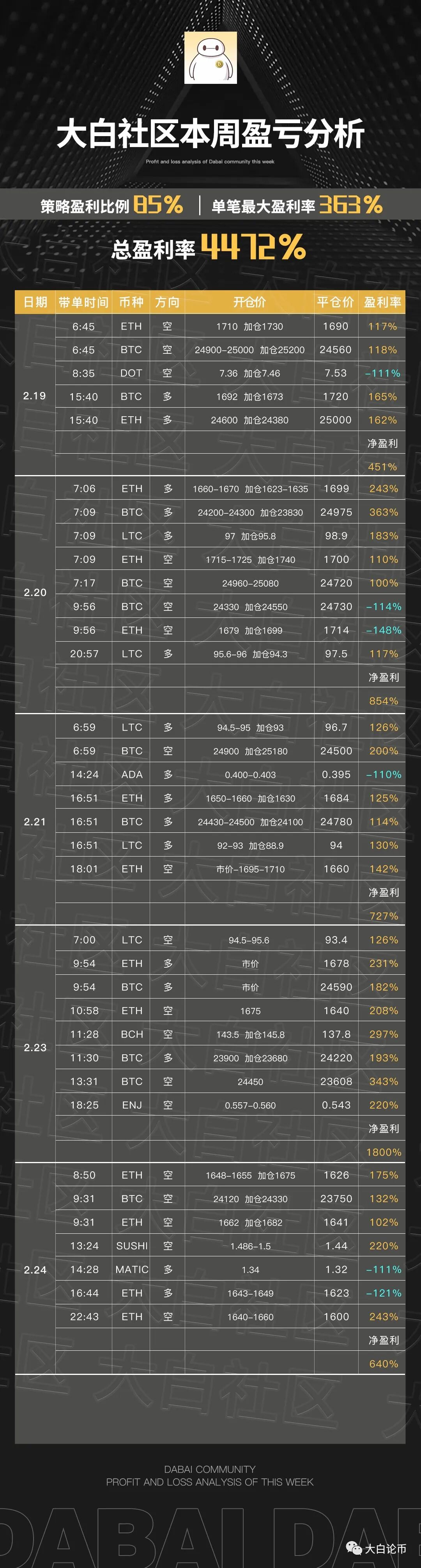 下方是大白社区本周实盘群单子,恭喜跟上的币友,如果你操作不顺,可以来试试水。