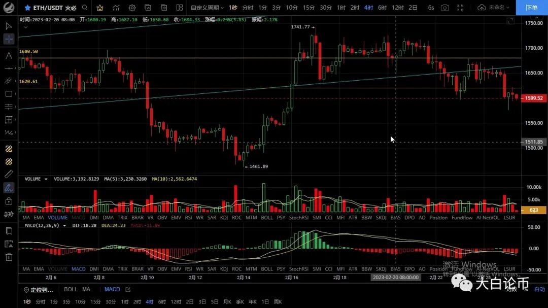 以太坊跌破上升通道支撑后昨日再次反抽未能站稳,随后行情震荡下行,晚间加速下跌,最低至1575一线支撑反弹,恭喜跟上昨日思路的朋友空单获利90点,目前币价在1600附近运行,四小时级别来看行情反弹上行受阻回落,macd空头运行双线死叉状态,裸k来看底部逐渐抬高,有反弹需求,短期关注反弹力度,上方1620阻力还是有效的,日线级别走势依旧偏弱,预计走延续的可能性较大,加上周线多头减弱空头增强,目前仍保持看空思路,破位前低有机会看到1550-1480,由于昨日跌幅较大预计日内会走震荡修复,思路上建议短线操作高空低多对待,上方压制1620-1650,下方支撑1575-1550