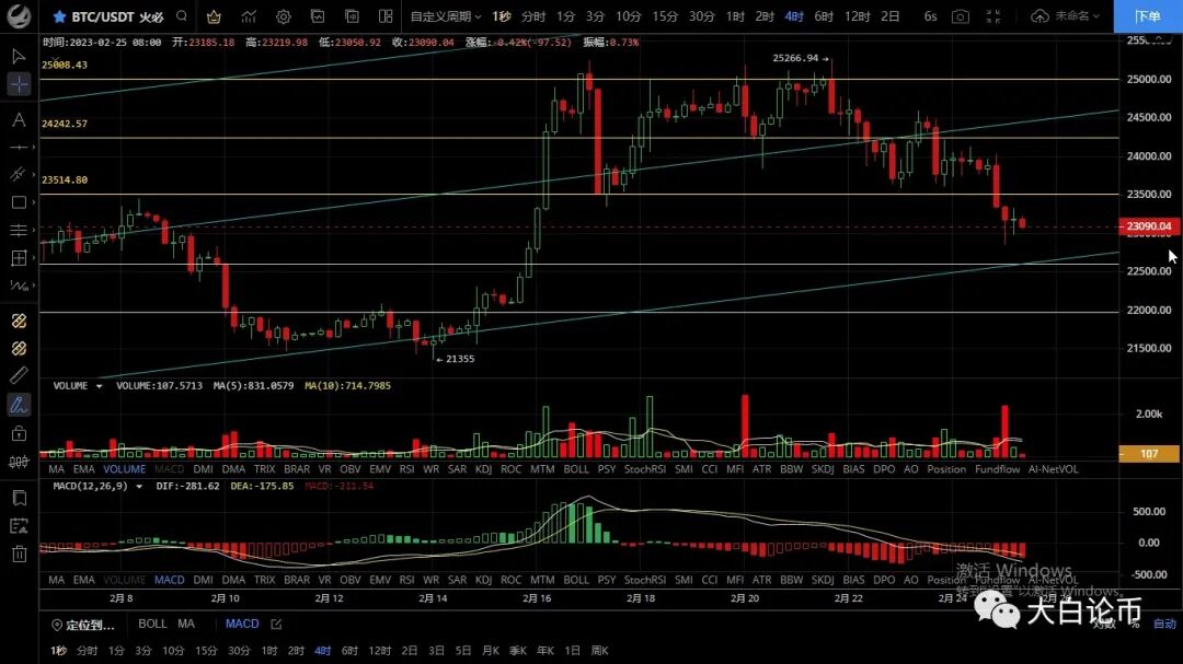 大饼昨日白盘波动不大,上方试探24200未能突破窄幅震荡后,晚间空头发力连阴下跌,最低至22850一线支撑反弹,恭喜跟上昨日思路的朋友空单获利1200点,目前币价在23080附近运行,小时级别来看行情处于震荡修复阶段,macd空头逐步缩量双线粘合,短期多空反复没有延续,四小时级别来看昨日下跌至22850支撑反弹,k线收阳后未能延续,多头反弹力度偏弱,macd空头逐步放量双线死叉向下运行,整体走势依旧偏向空头,有再次试探22800支撑需求,若无法有效跌破后市行情会再次反弹,短期波动不大加上周末原因思路建议短线为主高空低多对待,上方压制23300-23500,下方支撑22800-22300