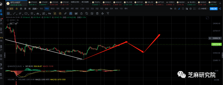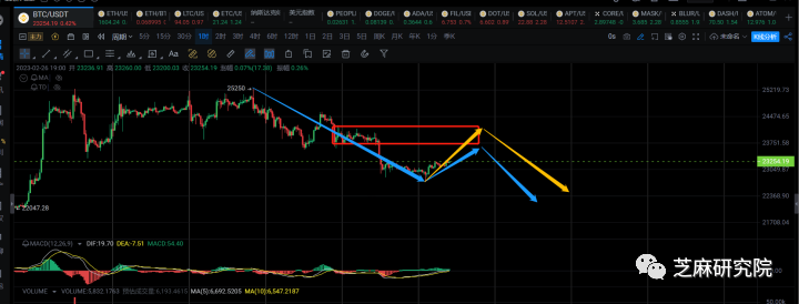 15分钟级别,这里还在运行第一笔15分钟级别的反弹,上方的阻力在23350~23500附近,当前23300附近可能已经结束第一笔了,开始走第二笔15分钟级别的回调,回踩23000附近,不跌破22800的话继续走第三笔15分钟级别的反弹。重点关注第三笔15分钟级别的反弹的力度。按照这里的时间,预期1h级别的反弹要走到明天早上。短线上这里建议第三笔15分钟上走完再做空会比较好。