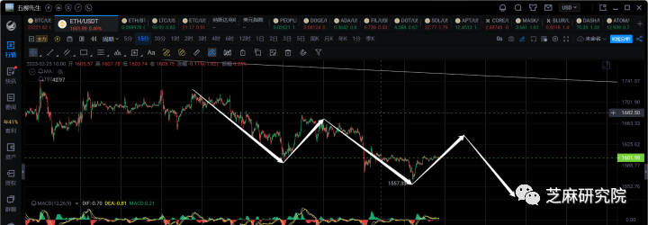 以太今年整体的走势是强还是弱,今年的走势其实是非常弱的,今年的反弹比不上大饼。昨天我们说下方的支撑在1550附近,凌晨最低到了1557,给出了1h的底背,那结构上1h级别的下跌可以结束了,这里运行一笔1h级别的反弹。反弹的力度可以关注1640,1660这两个位置,第一个突破了那么就有机会到1660附近,但如果1640没有有效突破的话,那就是一笔非常弱的反弹了。和大饼一样,反弹走完,大概还有一笔下跌,目标看到1520附近。