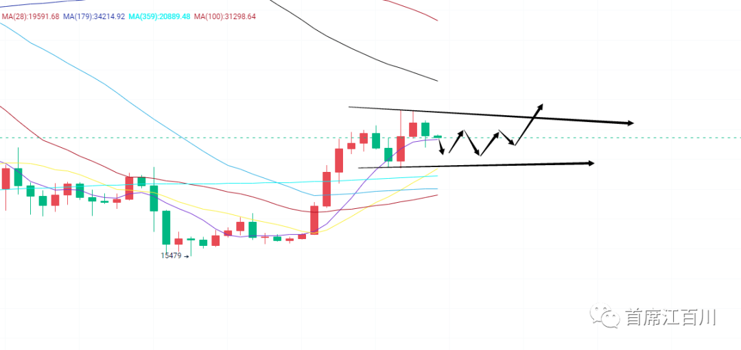 我们再来看看五日线,五日线就比较重要了,它的形态关乎市场强弱转变的关键,目前五日线刚收线,且前面组合成标准的并列线,这种形态想要拉盘就必须不破5日线低点并且在当下阶段也就是3月4号之前收出倍阳或者三倍阳线,否则就还是会走弱势震荡路线,大致路线如图所示,要不不破低点倍阳或者三倍阳复制前一段拉盘模式,这就是走强;要么就是在消耗一个月左右维持三角震荡格局,到后续再重新选择上行还是下行。通常而言,前面21300一线并列低点不会跌破,但过程会非常繁琐。