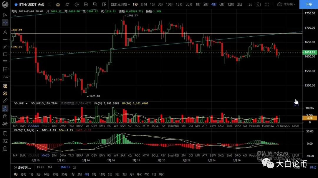 以太坊昨日白盘低位跌至1616一线给到我们进场机会,随后行情上行至1647一线承压回落,凌晨空头发力加速下跌最低至1594附近,恭喜跟上昨日思路的朋友多空双吃共计近80点,目前币价在1617附近运行,四小时级别k线由阴转阳向上反弹,macd多头转空双线粘合,ma均线呈向下指引状态,短期行情暂时止跌但反弹力度不大,先关注1620能否突破,若无法站稳仍会继续下探支撑,整体走势依旧偏弱,多单切勿着急进场,下方不破位不进多,若1550附近给到机会短线可看100点反弹,日内思路建议低多为主高空为辅,激进先空后多,上方压制1620-1650,下方支撑1580-1550