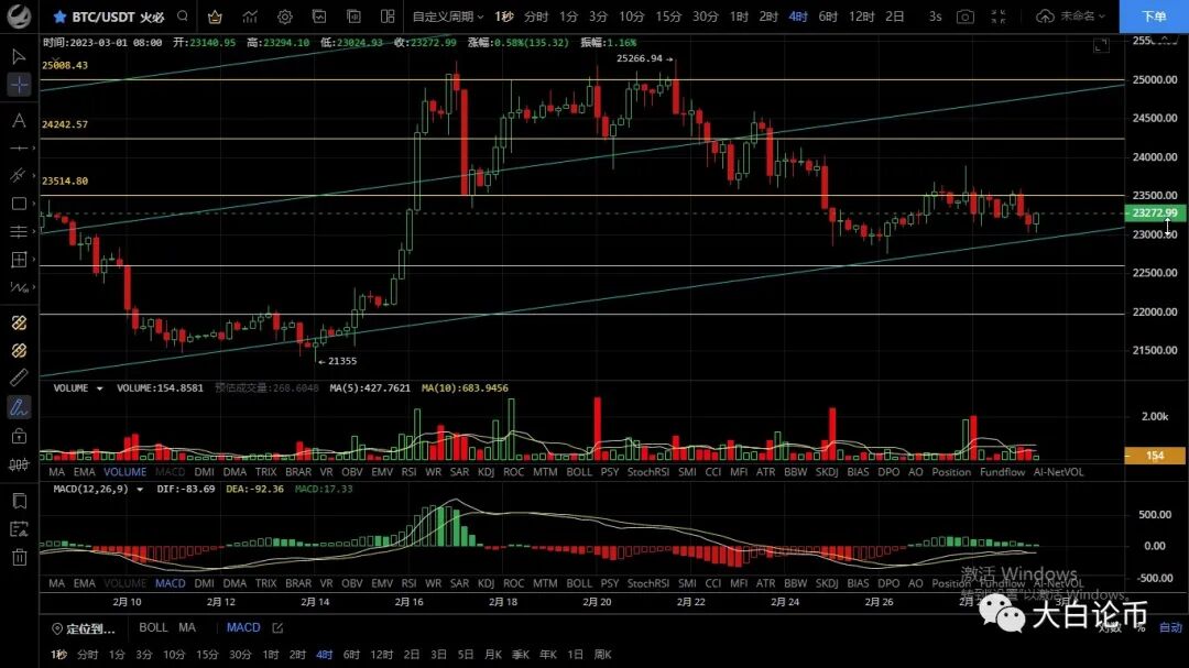 大饼昨日走势先跌后涨,白盘跌至23209一线支撑反弹,凌晨最高触及23600附近承压回落,随后一路下跌至23000关口附近,恭喜跟上昨日思路的朋友多空双吃共计获利900点,目前币价在23280附近运行,四小时级别和思路一致行情再次试探通道支撑未破,形成双底走出反弹,macd多头逐步缩量双线粘合有死叉迹象,目前走势来看行情反弹力度偏弱,ma均线向下指引,上方承压明显,短期仍有下跌的可能,月线以十字阳k收线说明多空焦灼,macd空头缩量减弱多头增强快线拐头向上有形成金叉的走向,若能给到22350附近有机会做趋势,日内思路建议低多为主高空为辅,激进先空后多,上方压制23500-23800,下方支撑23000-22800