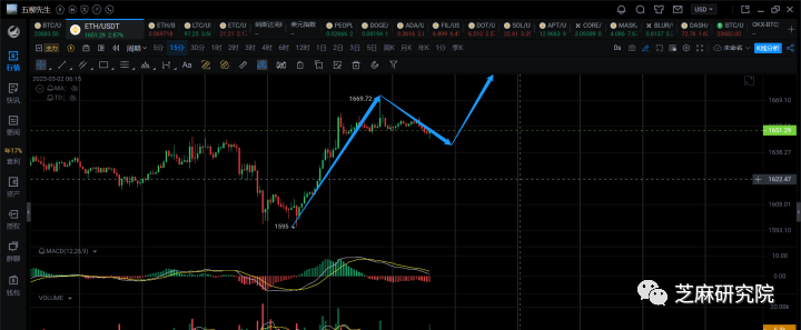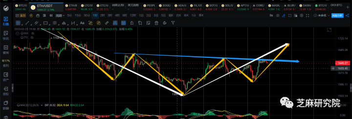 形态上,这里有一个头肩底的形态,是否会走出一波比大饼强势一点的反弹去1700上方呢,目前暂时不得而知。以太的汇率是日线底背的状态,所以做空以太的话,可能没有大饼好,应该先避免。防止再次上去。