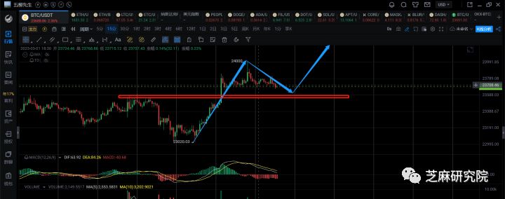 那么今天再次反弹到24000附近,是不是就直接去很高的位置呢?这个问题我在上周的时候已经说过了,大饼日线顶背,即便顶背后没回调多少继续拉盘,那基本上也拉不了多少,向上5~10个点,就会被困住。所以日线级别回调只会迟到不会缺席。
